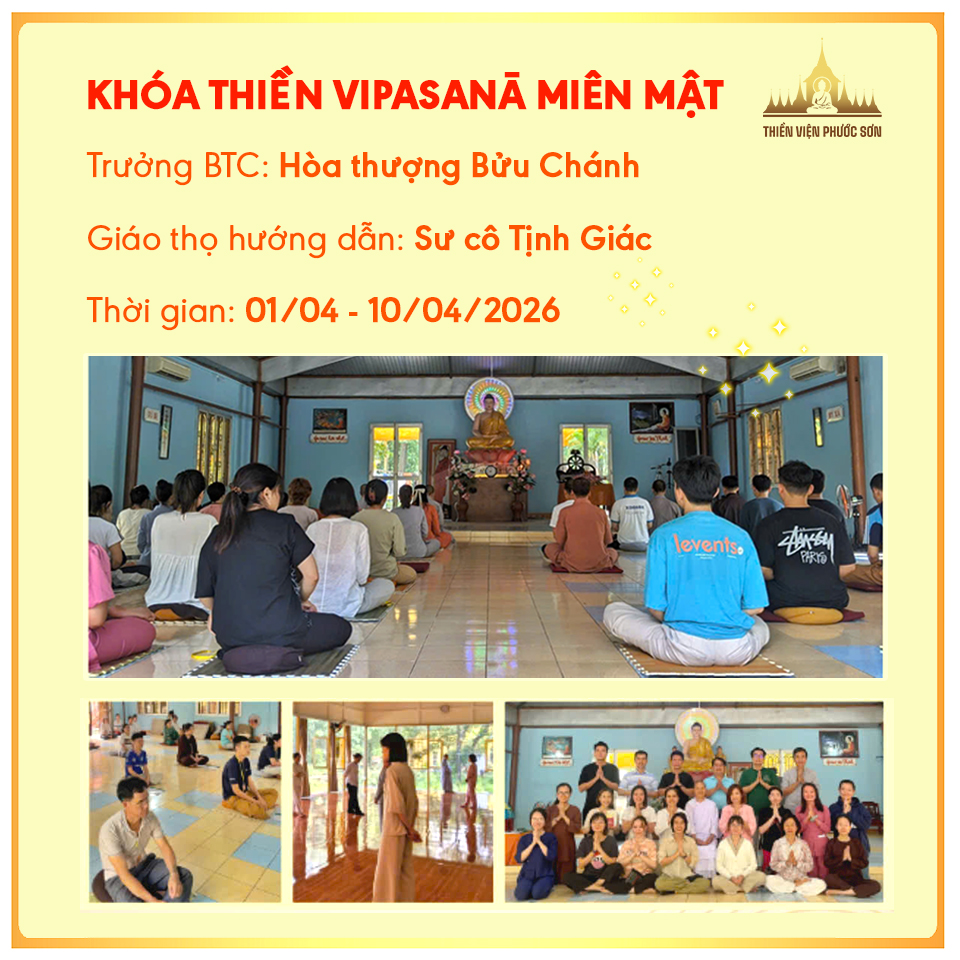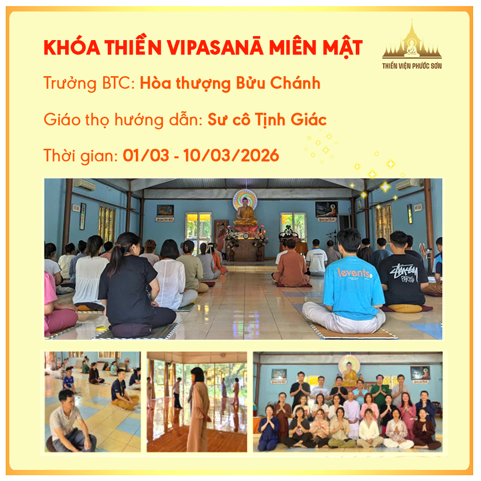 * Ghi chú: Các khóa thiền Vipassanā miên mật yêu cầu thiền sinh tham gia đầy đủ các thời khóa hành thiền và bám sát nội quy tu tập.